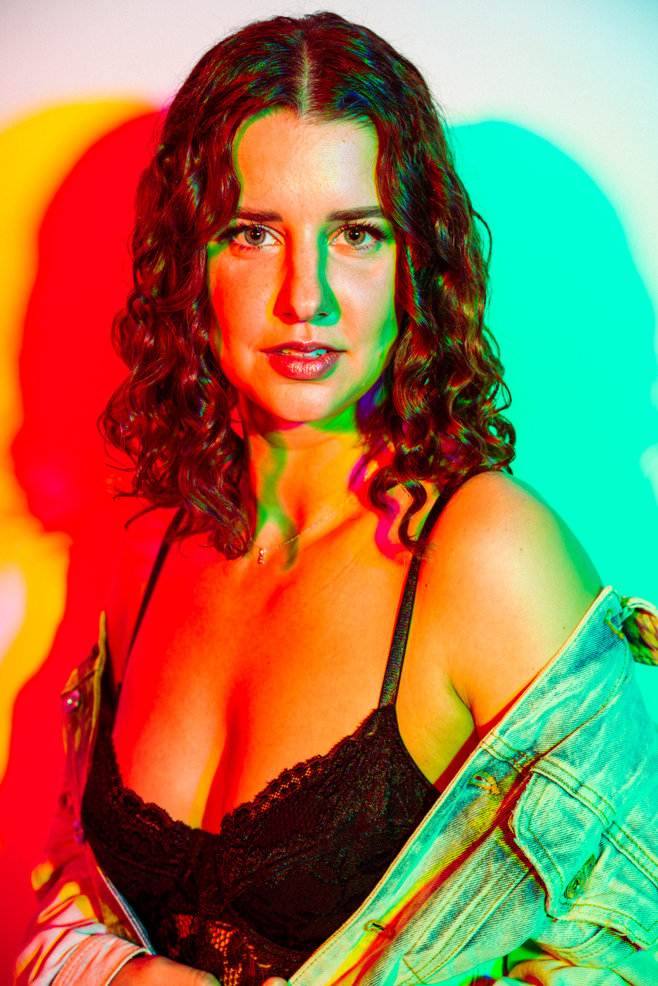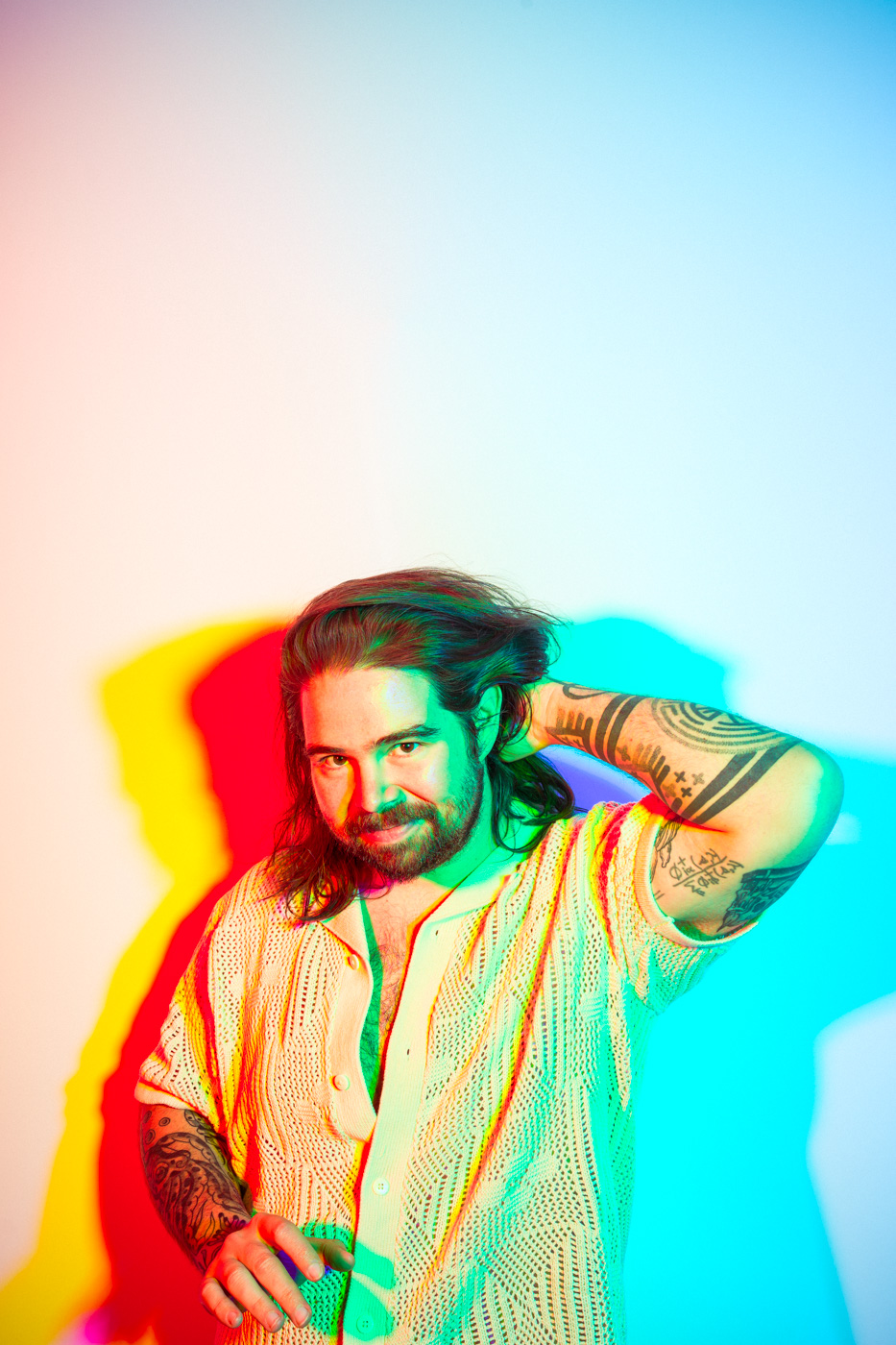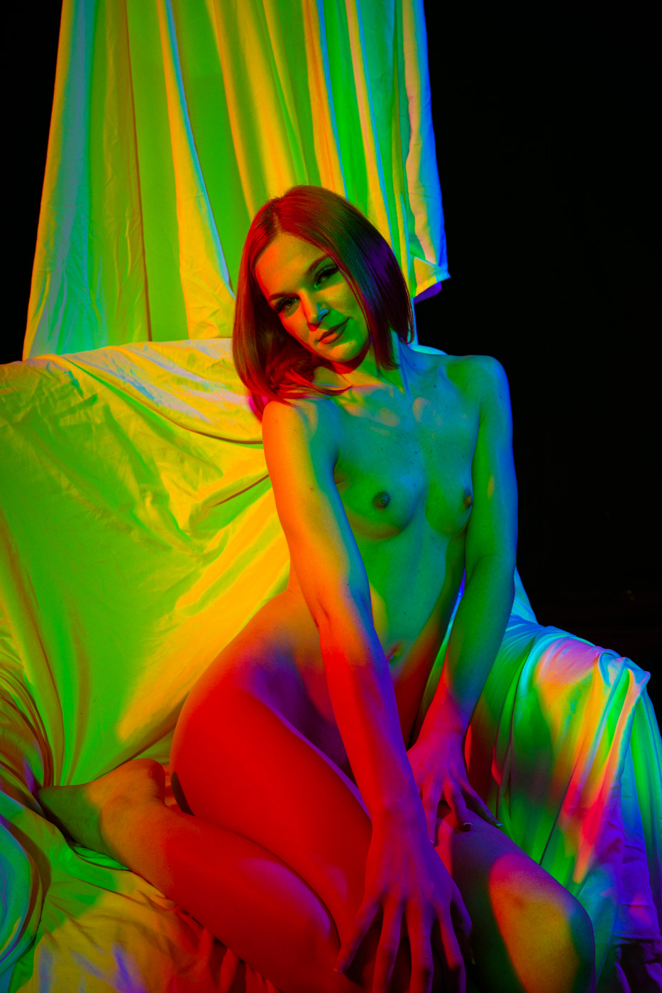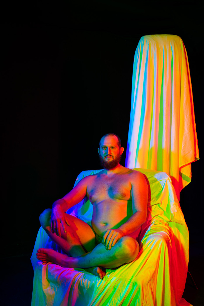 White light, as the human eye understands it, is composed of equal parts red, green, and blue. By isolating and recombining these colors in the studio, I can paint with light itself—an intentionally unstable palette that resists full control. In these portraits, shadows split and recombine, drifting in color around the body and allowing chance to shape the image as much as intention.