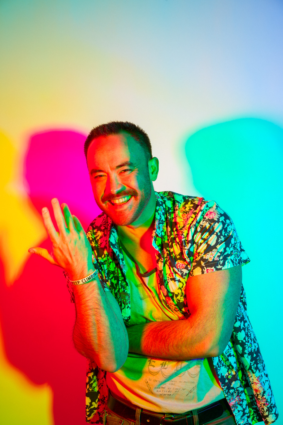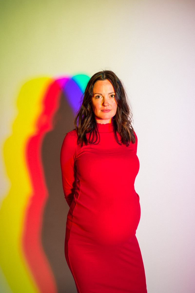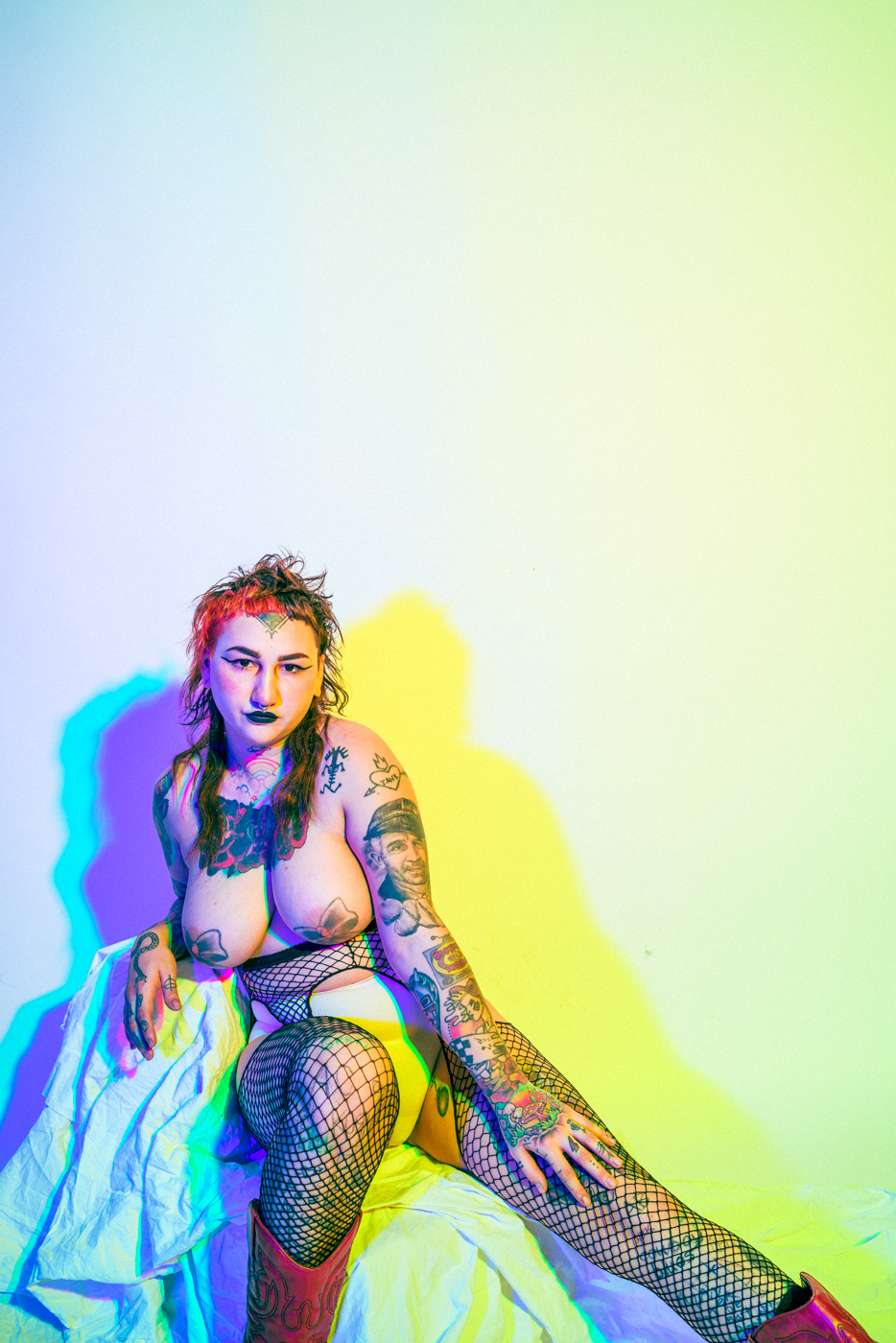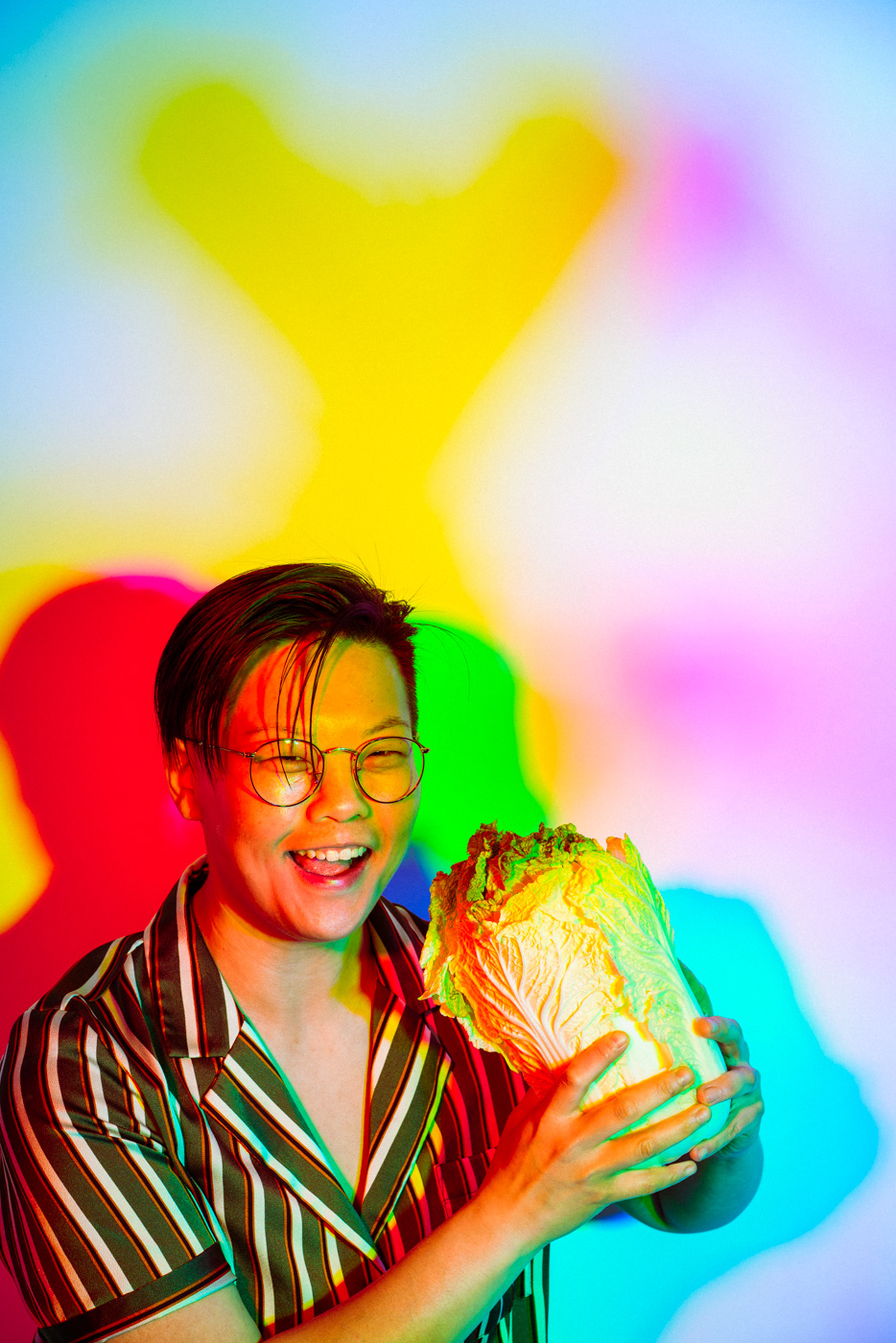 White light, as the human eye understands it, is composed of equal parts red, green, and blue. By isolating and recombining these colors in the studio, I can paint with light itself—an intentionally unstable palette that resists full control. In these portraits, shadows split and recombine, drifting in color around the body and allowing chance to shape the image as much as intention.